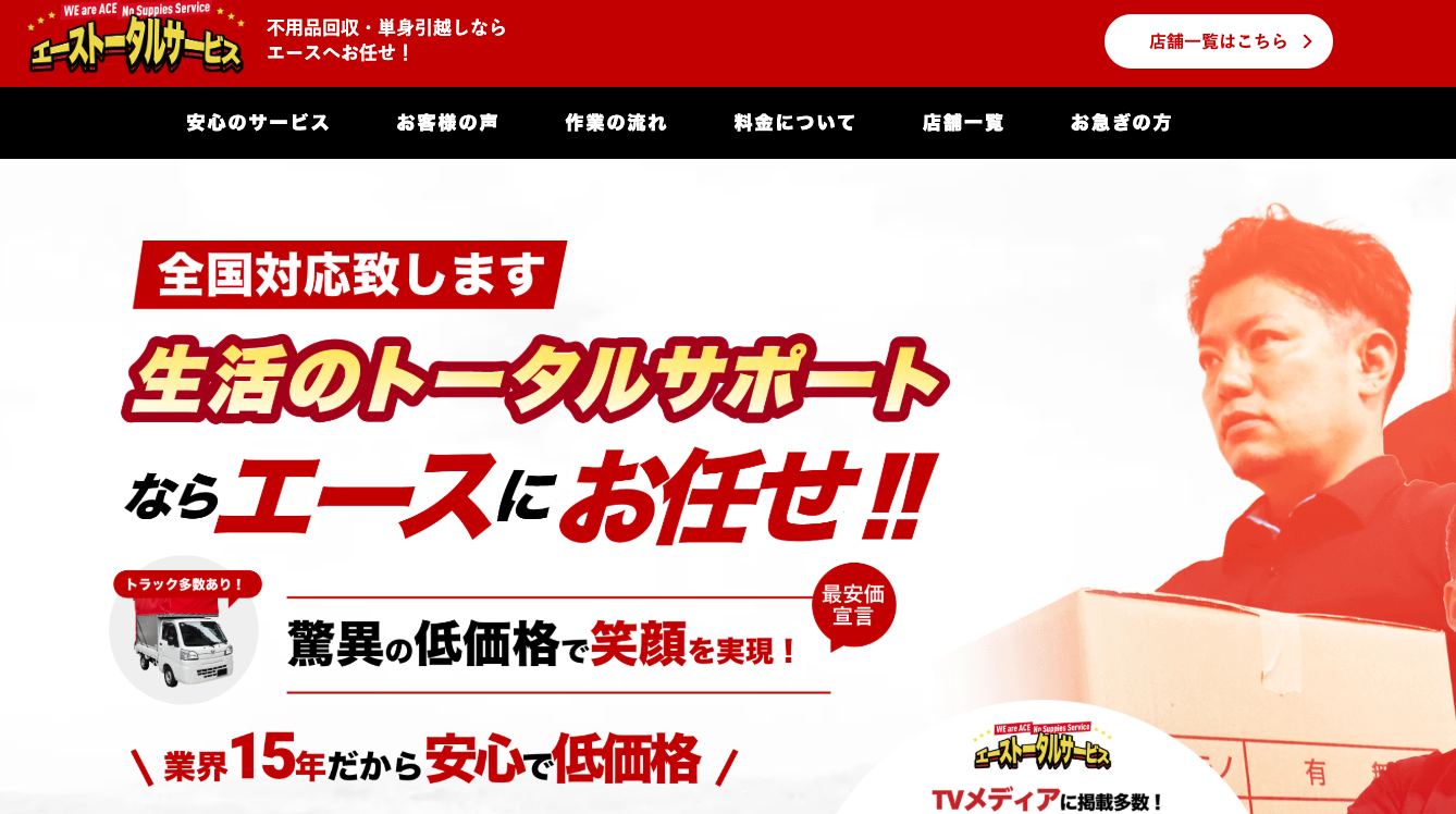 エーストータルサービスは、関西全域で活動している不用品回収業者です。「業界最安値」にこだわっており、競合他社の見積もりが1円でも安い場合には、最大50%の大幅割引を実施するなど、徹底したコストパフォーマンスが高いのが魅力です。