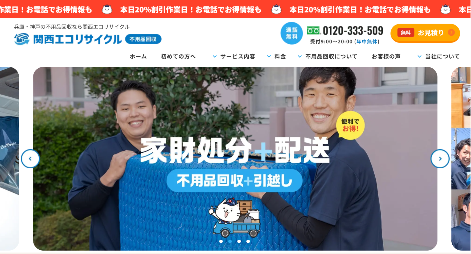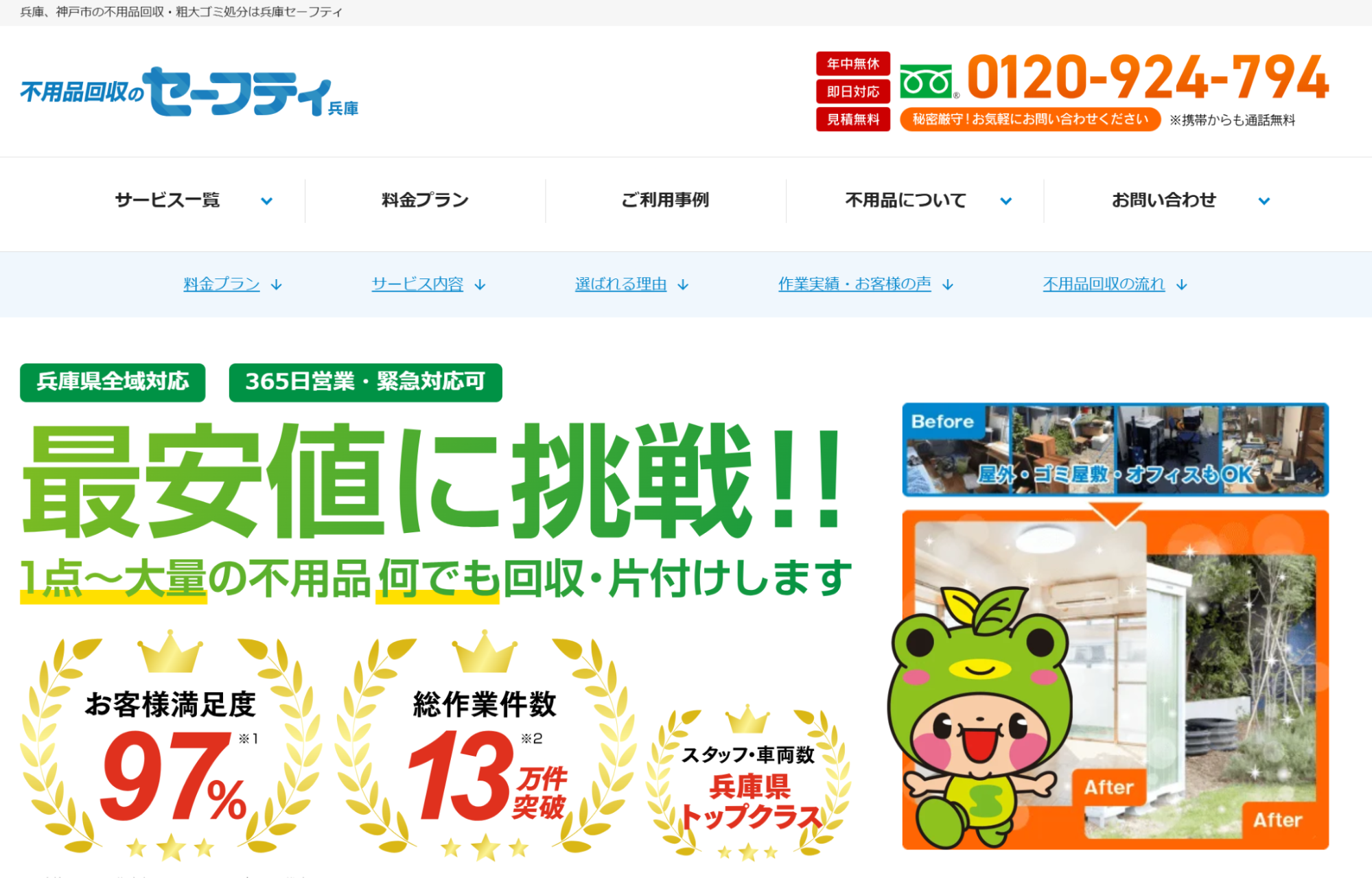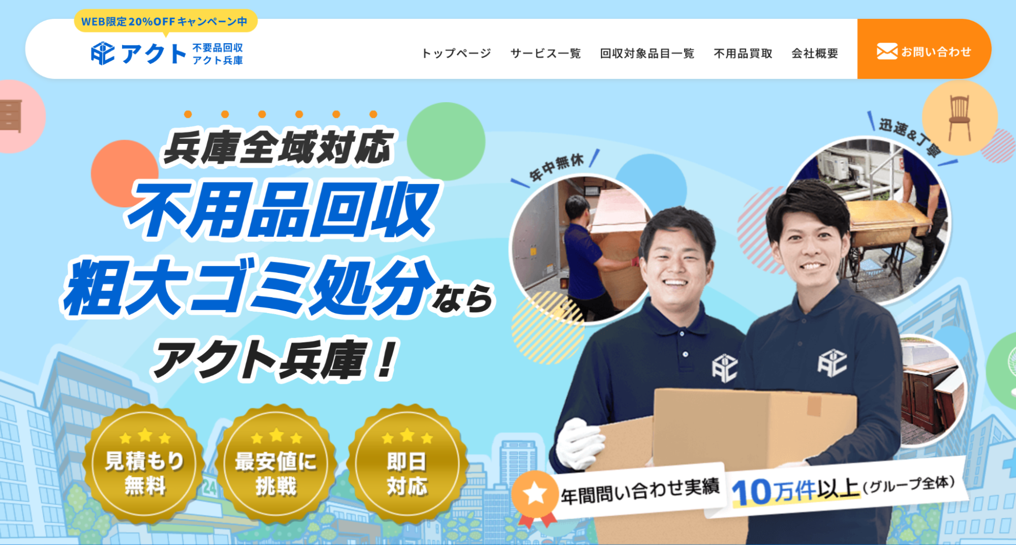 不用品回収アクト神戸は、兵庫県全域と神戸市で不用品回収と粗大ゴミ処分を行っている会社です。業界最安値に挑戦しており、追加料金もないので、安心して利用できます。