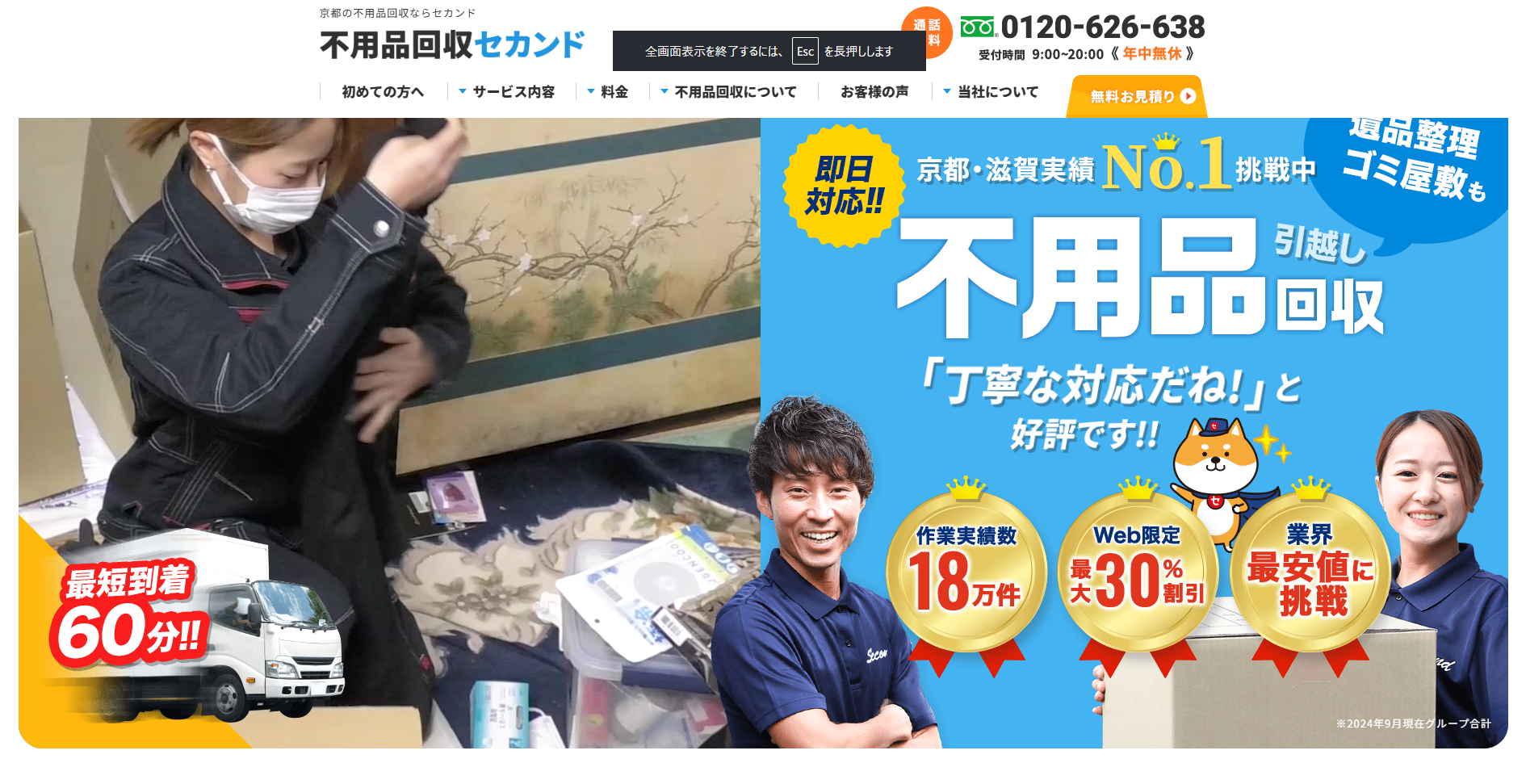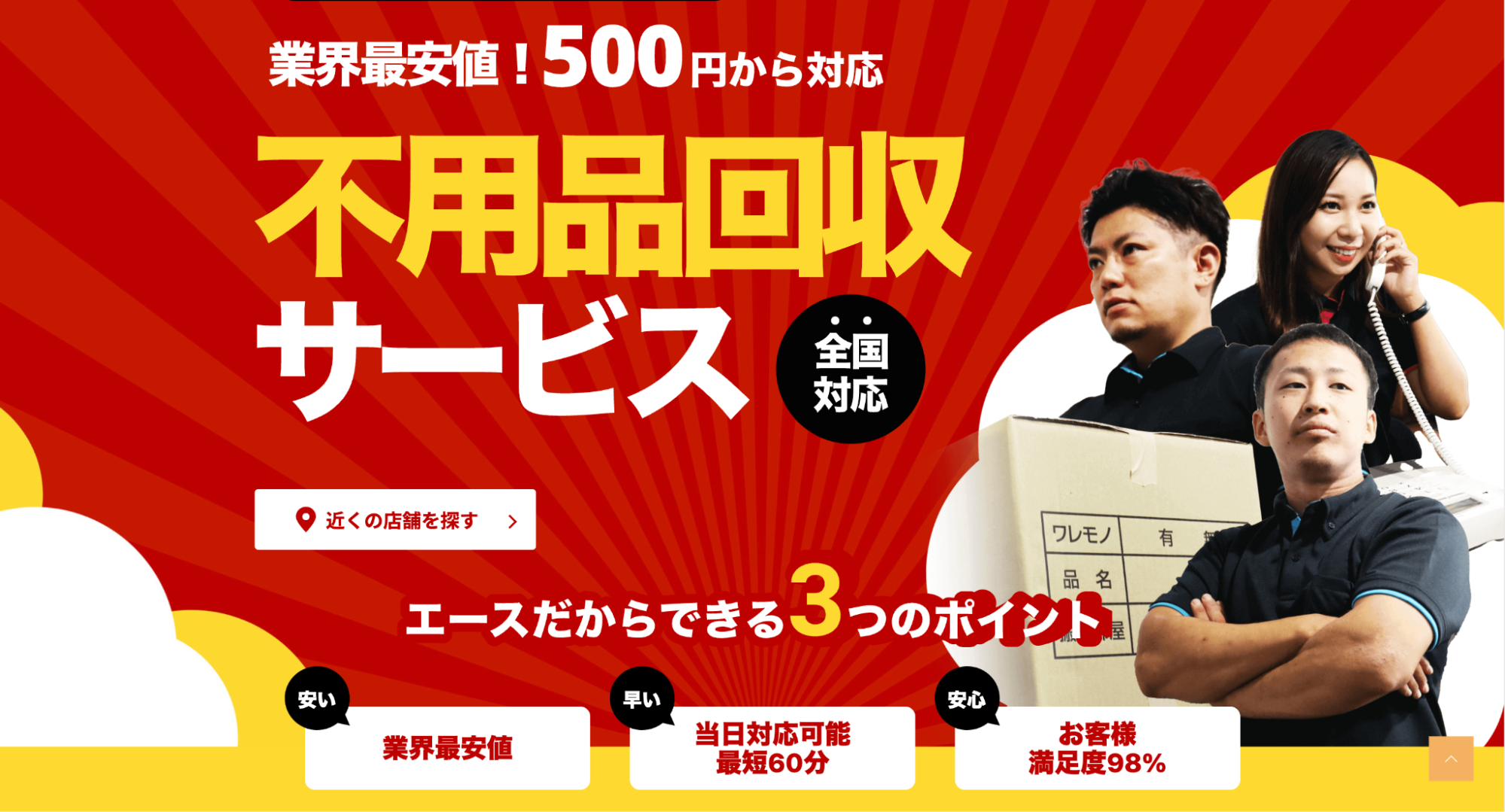 エーストータルサービス京都店は、お客さま満足度が98%、口コミでも高評価を得ている不用品回収業者です。メディア出演の実績が多数あり、行政・大手企業との取引も豊富で、信頼が厚いのも魅力です。