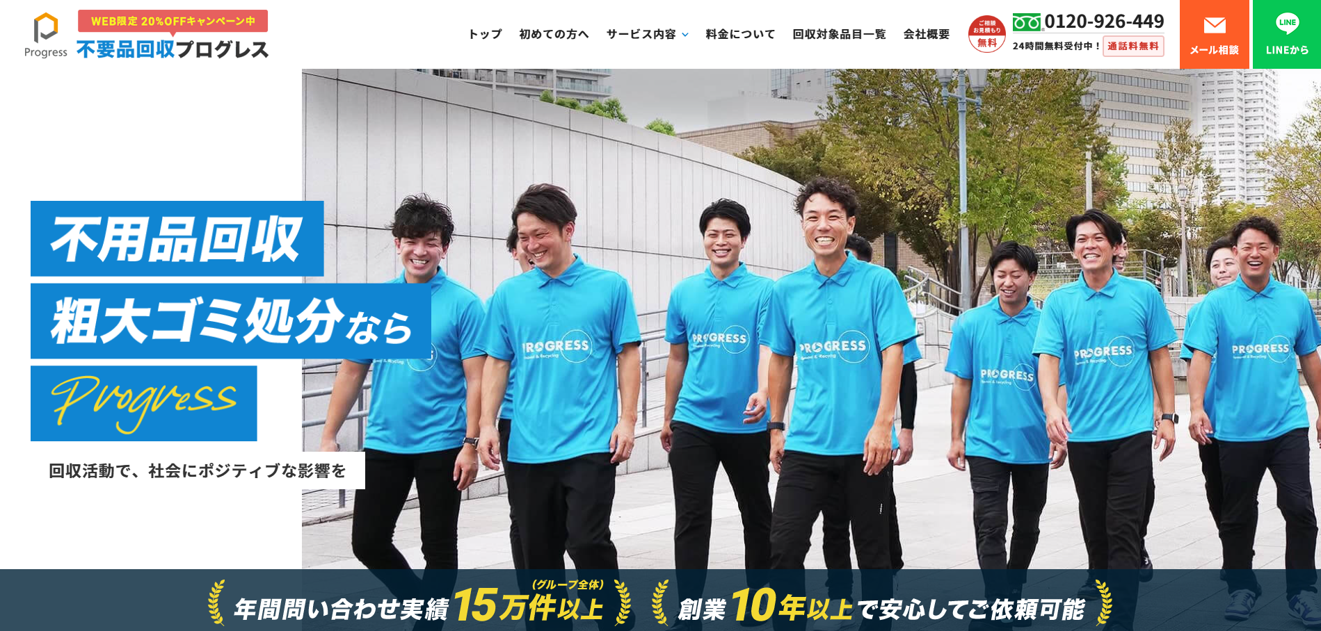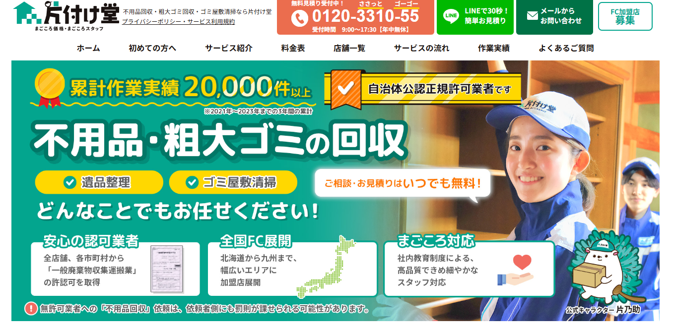 即日最短のスピード対応で、急な依頼にも最短10分で見積もりが可能です。不用品回収と買取も同時に行っており、買取金額を作業費から差し引き、料金を抑えられるのがメリットです。